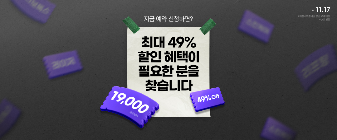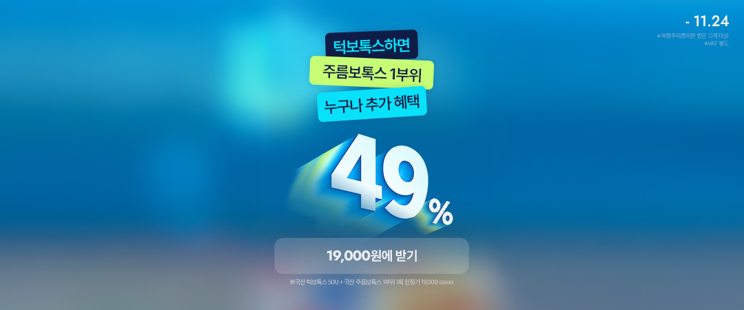 [누구나,무조건혜택 증정!] 국산 스킨보톡스 1부위 1회 한정가▶국산 보톡스로 피부 타이트닝, 잔주름, 주름, 모공 축소 개선 *부위 : 턱라인, 나비존, 이마 中 선택 *이벤트 기간 내 신청 가능하며, 1회 한정 이벤트입니다. *이벤트 기간 : ~2025.11.17까지