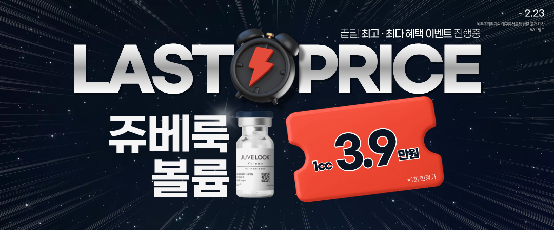 쥬베룩 볼륨 1cc (2cc 이상 시)▶고분자 PLA와 인체 피부 조직에 존재하는 히알루론산을 결합시킨 자가 조직 재생 콜라겐 볼륨 부스터 *제외 부위 : 입술, 코, 턱, 애교, 미세주름 *이벤트 기간 : ~2026.02.23까지
