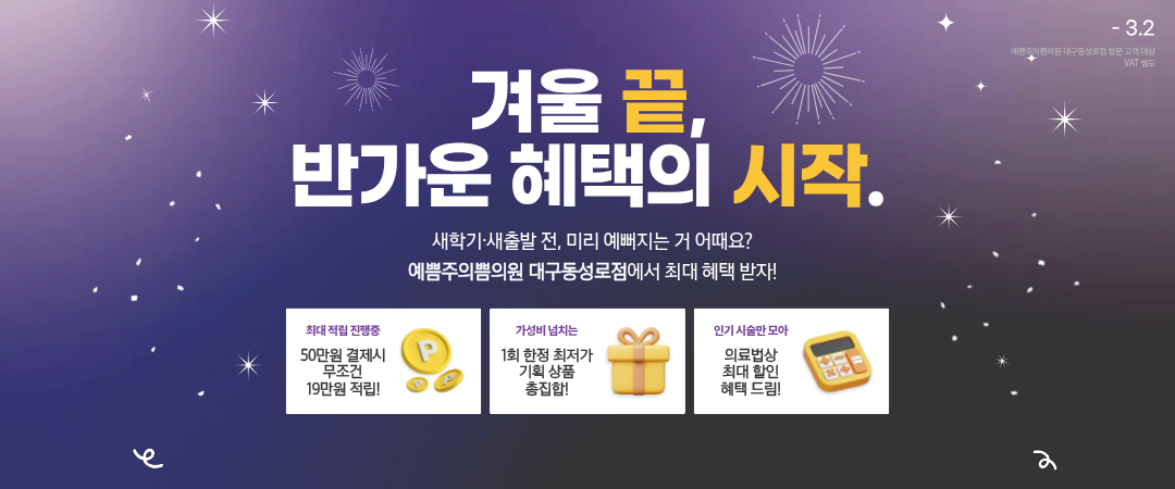 염증주사 1개 1회 한정가▶염증이 있는 부위가 더욱 커지는 것을 막아주고 피지, 농 배출 치료 *이벤트 기간 내 신청 가능하며, 1회 한정 이벤트입니다. *이벤트 기간 : ~2026.03.02까지
