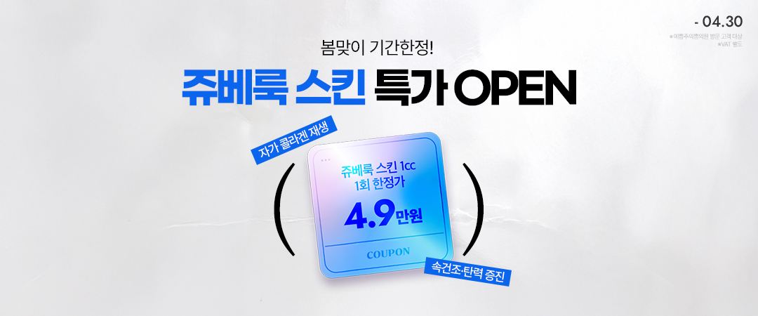 쥬베룩 스킨부스터 1cc▶고분자 PLA와 인체 피부 조직에 존재하는 히알루론산을 결합시킨 자가 조직 재생 콜라겐 부스터 *제외 부위 : 눈밑, 이마 *이벤트 기간 : ~2026.04.30까지